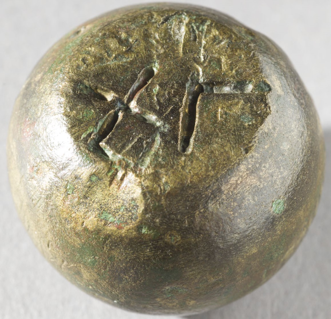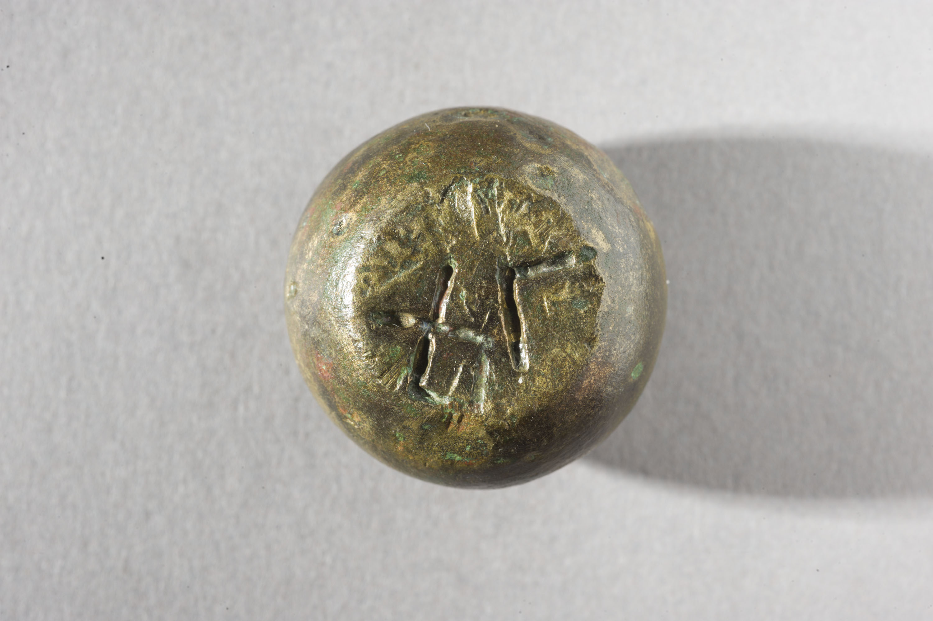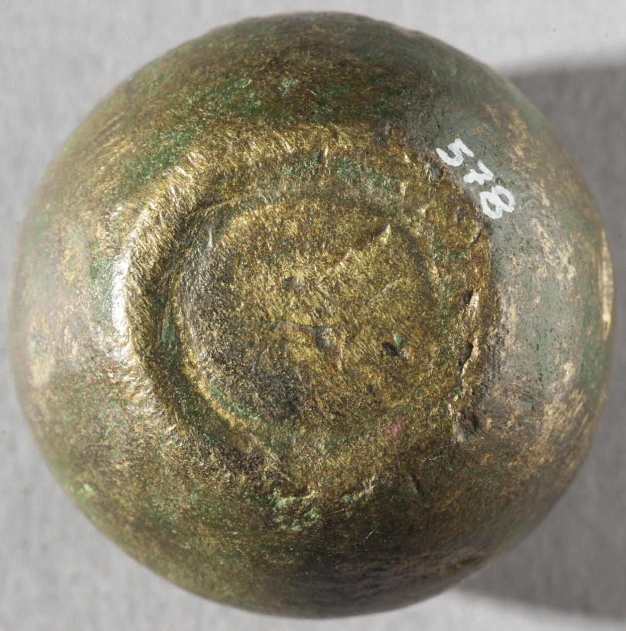 CPAI III/2: Flattened sphere doubly truncated in form; engraved on the top with the denominational mark Γ, originally inlaid but inlay is missing. The bottom is blank but hollowed. It is a three-ounkia (ounkia of 28.11g). The mass of this weight is high according to a libra or ounkia for the 4th century or later. Patinated.