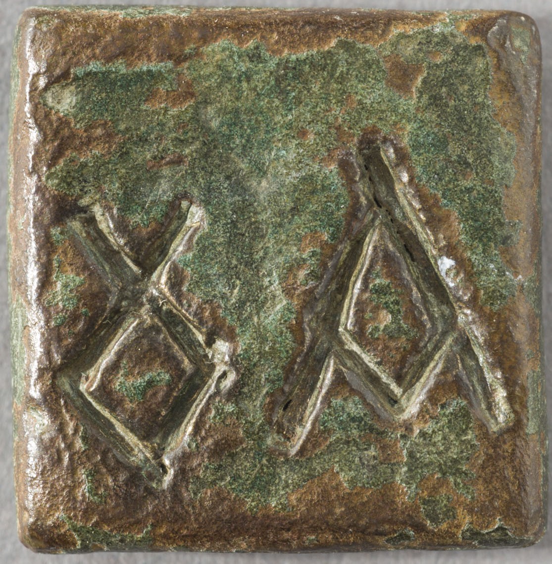 CPAI III/2: Square in form with plain profile; engraved on the top with the denominational mark Α, originally inlaid but inlay is missing (this is the case for its low mass). The bottom is blank but depressions. It is a one-ounkia. Patinated and worn.