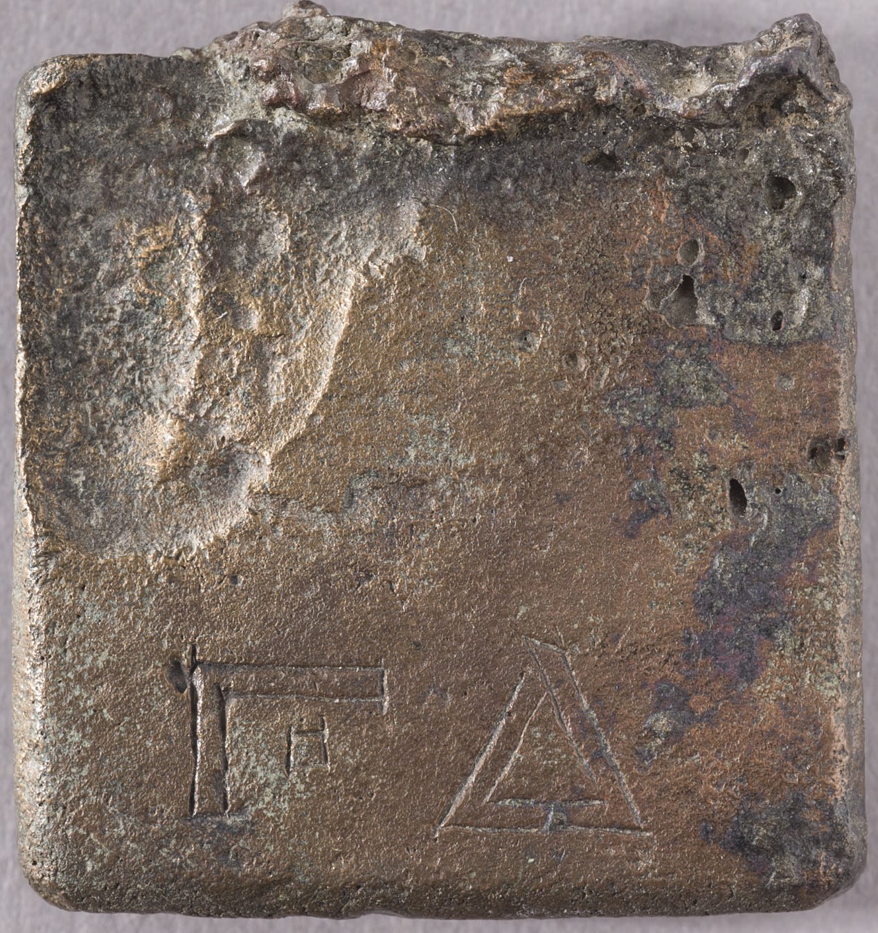 CPAI III/2: Square in form with plain profile; some part on the left corner is missing; doubly engraved on the top, in the lower part, with the denominational mark Δ. The bottom is blank. It is a four-ounkia (ounkia of 24.76 g). Patinated. The letters seems to be engraved later; the form of gamma is different; there is too much space on the upper half; although its mass may correspond to the denominational mark, it doesn’t seem genuine.