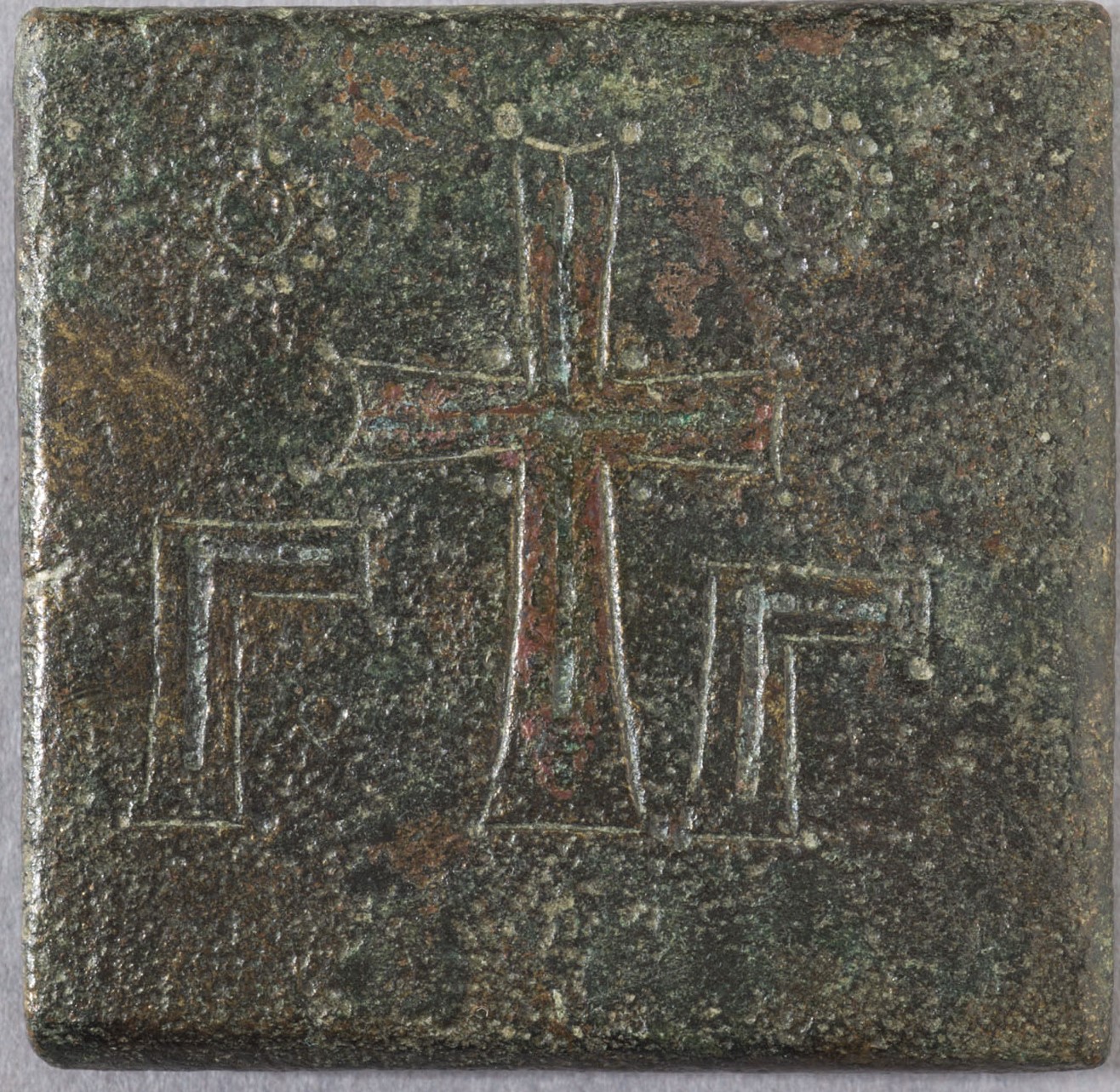 CPAI III/2: Square in form with plain profile; engraved and punched on the top with a Latin cross flanked by the denominational mark Γ; both inlaid but inlay is missing; in the upper corners, a circular motif. The bottom is blank. It is a three-ounkia (ounkia of 26.72 g). Patinated.